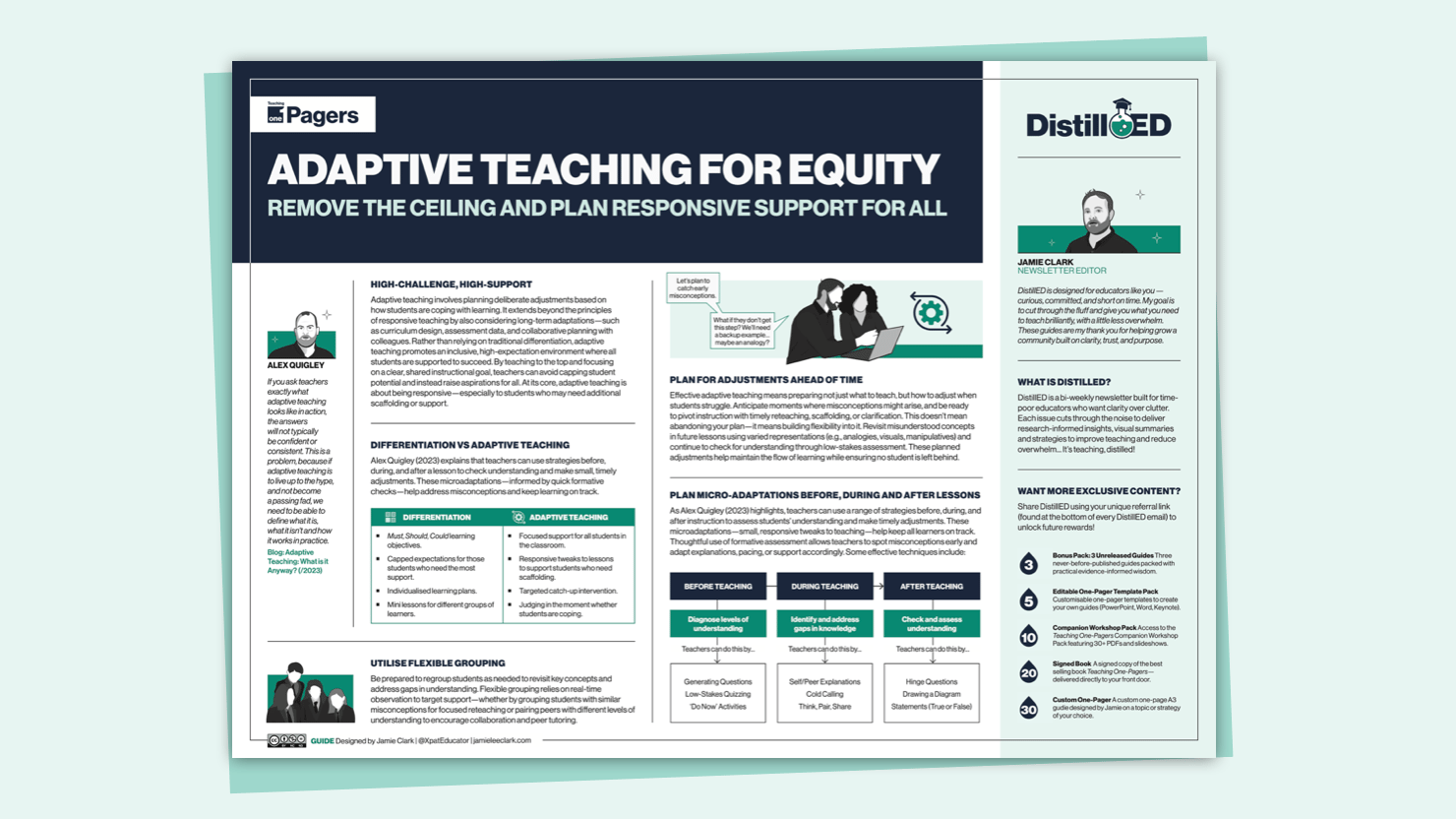 To help you put these ideas into practice straight away, download the Adaptive Teaching One-Page Guide — a classroom-ready resource designed to help you maintain high expectations, provide responsive scaffolds, and make in-the-moment adjustments that keep all learners moving forward without lowering the challenge.