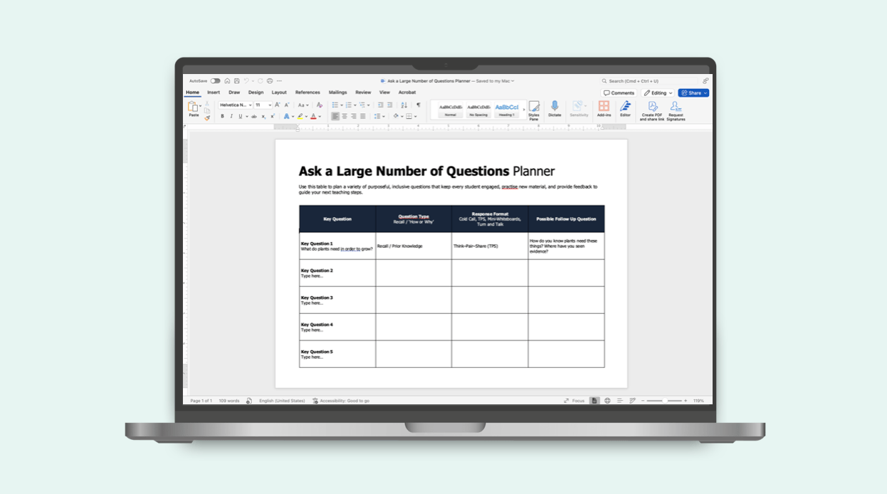 To support your use of Asking a Large Number of Questions, I’ve created a Question Planning Template — a simple, printable table where you can plan your key questions, choose the formats you’ll use (cold calling, turn and talk, mini-whiteboards), and anticipate student responses and misconceptions. Perfect for making questioning more deliberate, inclusive, and responsive.
