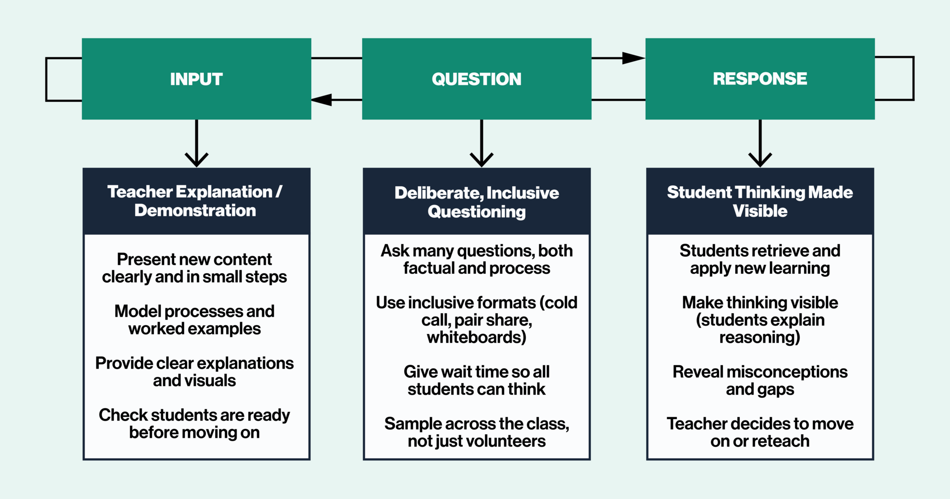 The diagram below captures the loop: input, question, response — turning lessons into an ongoing dialogue that engages every learner and strengthens understanding.