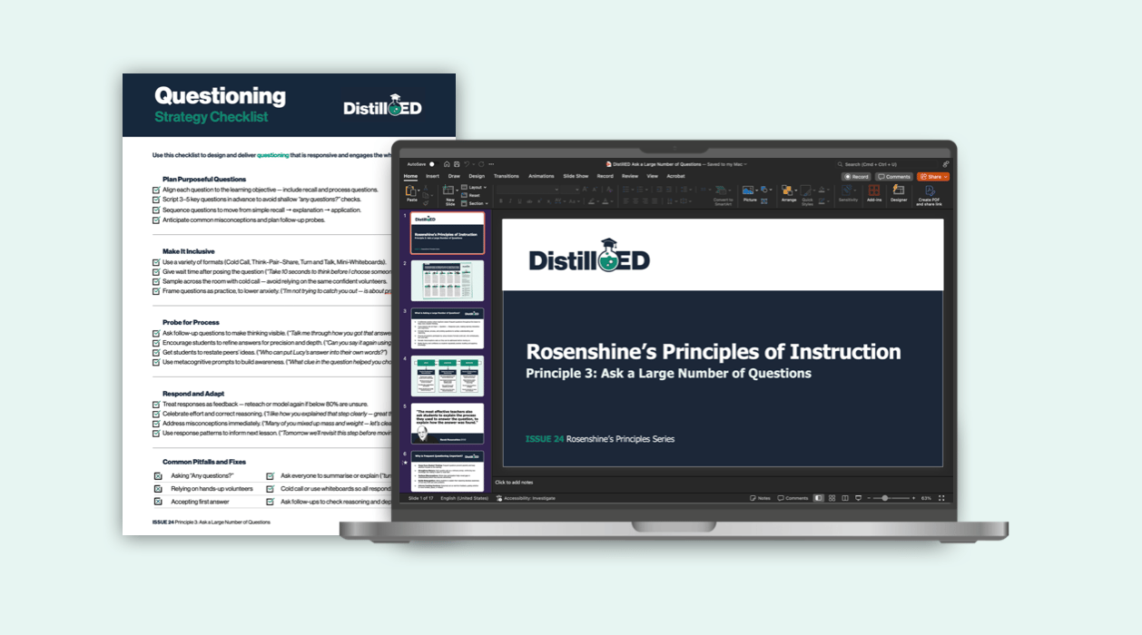 In this edition of ⚗️DistillED, we dive into Asking a Large Number of Questions—Rosenshine’s third Principle of Instruction. Questioning is the heartbeat of great teaching: it keeps every student thinking, provides practice with new material, and gives you instant feedback on whether to move on or pause and reteach.
