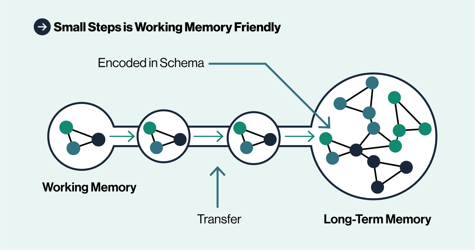 The diagram below visualises how small steps and dedicated practice helps students process new information and rehearse it until it become fluent. This increases the likelihood that it will be encoded and connected to existing knowledge in long-term memory.