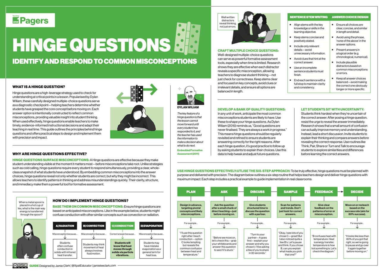 Popularised by Dylan Wiliam, it acts as a “hinge” in the learning sequence—helping you decide whether to move forward, pause, or reteach based on student responses. It is most effective when each answer option is crafted to reflect a common misconception, giving you insight into student thinking in real time. When paired with tools like mini-whiteboards, hinge questions become a powerful way to catch errors early and steer instruction on the spot.