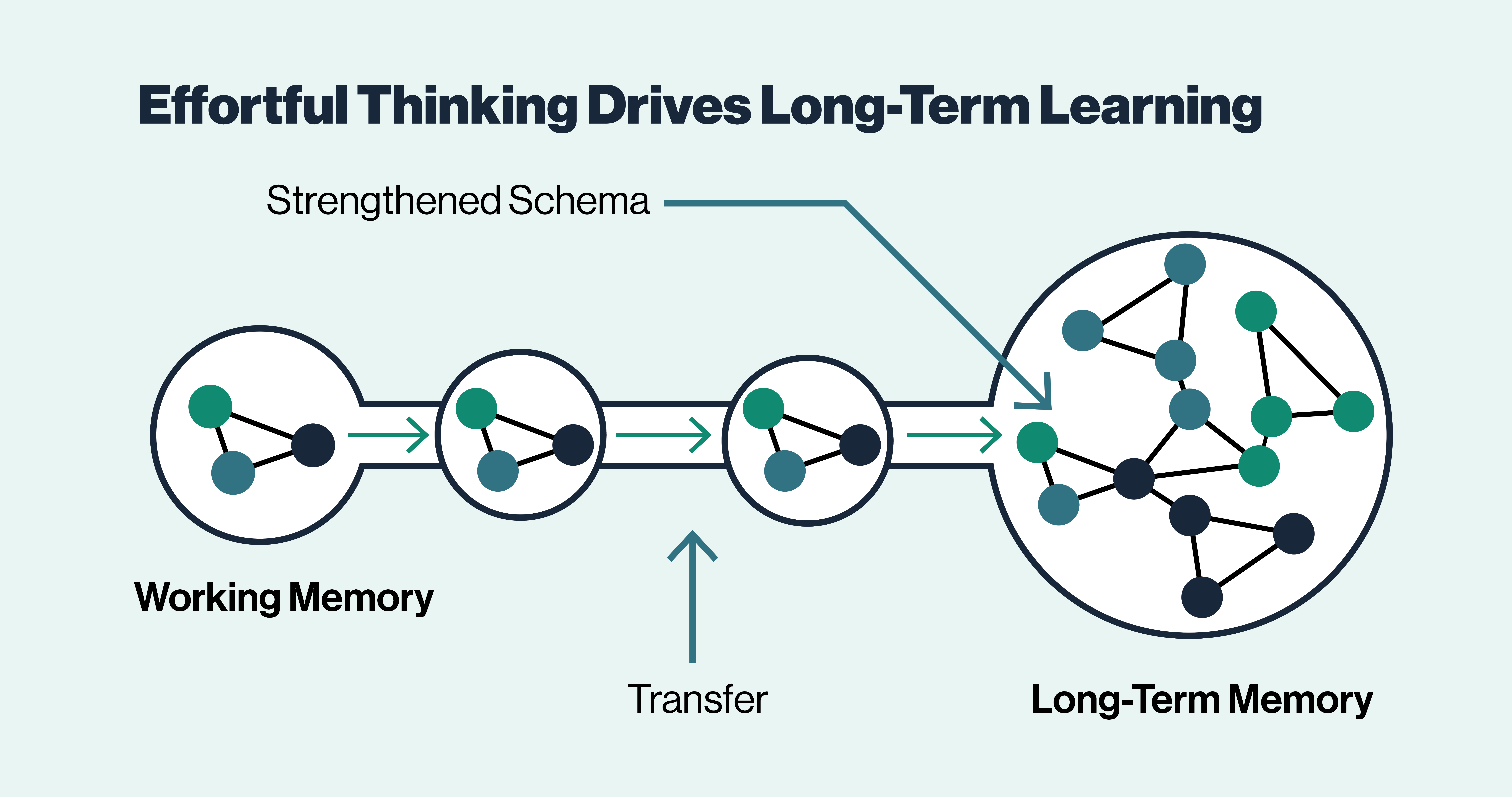 The problem isn't that students are working. The problem is what they're working on — and how much thinking that work actually requires. As the diagram below shows, it's effortful thinking in working memory that drives the transfer of knowledge into long-term memory, where it connects with existing schema and becomes something durable and retrievable. A task that requires no real thinking might keep students occupied — but it won't move the needle on what they actually learn and remember.