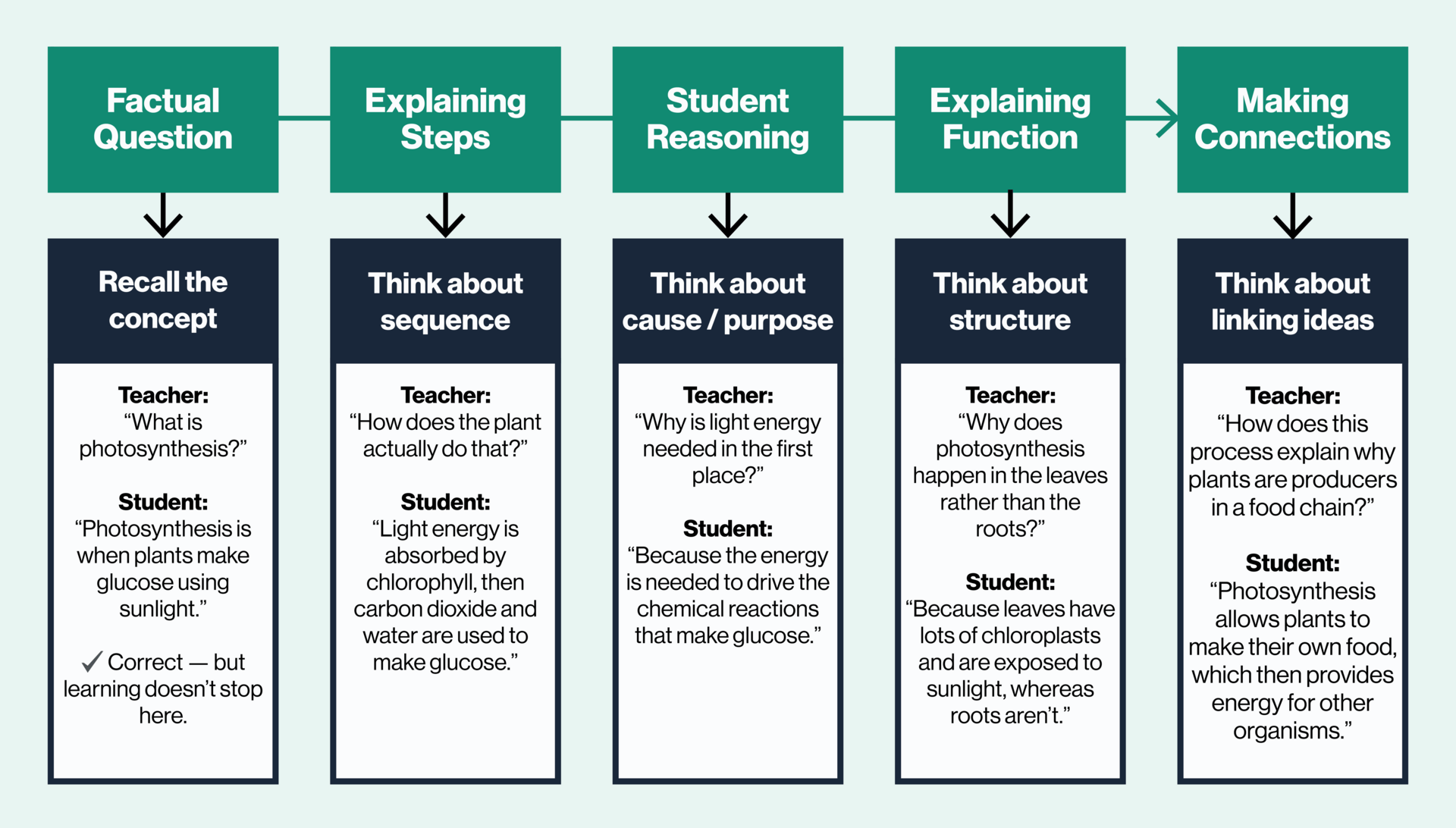 | Use process questions across lessons, subjects, and question types — including errors and non-examples. Revisit common reasoning patterns to strengthen schemas over time. | “Last lesson, several people explained density by describing the steps. Let’s practise that again.” |