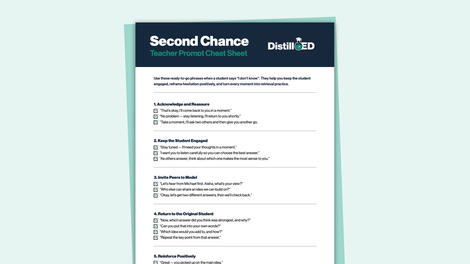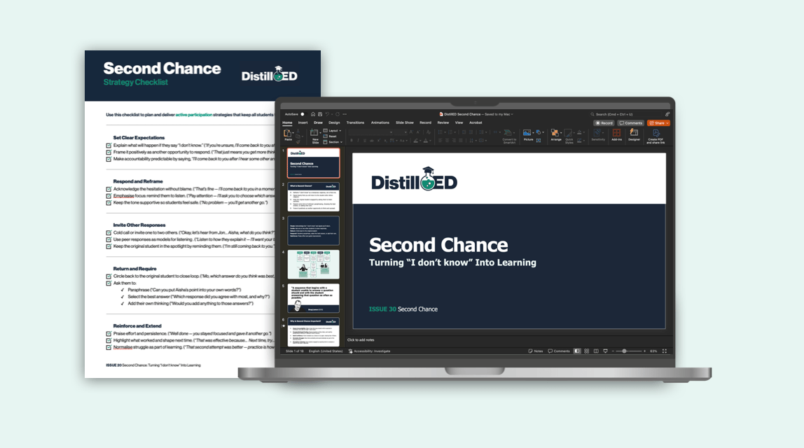 In this edition of ⚗️DistillED, we explore the Second Chance strategy—sometimes known as No Opt Out (Doug Lemov, Teach Like a Champion)—a simple but powerful way to keep students accountable, build confidence, and strengthen classroom culture.